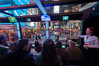 THE RIDE’s specially-designed custom vehicles are the tallest allowed by federal law on city streets. The bus is fitted with stadium-style seating that orients riders sidways to look through massive windows, and two on-board hosts banter comedically as they travel through the streets of midtown Manhattan, commenting on New York’s history and its iconic sites and structures, and giving insider secrets about the city – all while incorporating actors and performers along the route who interact with the vehicle and its passengers. External speakers and exterior lighting allow the on-board hosts to make everyone on the street part of the experience. Surprises show up all along the route, featuring sites from the Chrysler Building and Grand Central Terminal to Times Square and Columbus Circle.
