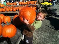 Well, off we went to the first pumpkin farm where my son found the “biggest pumpkin EVER!!! (See below). I have no idea how he managed to carry that thing! It weighed at least 25 pounds! And I pulled a back muscle hoisting that thing into the trunk of my car! But that was the pumpkin my son declared was the, “biggest pumpkin EVER,” so that was the one we bought!